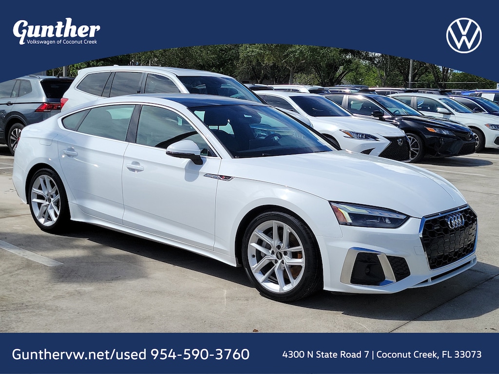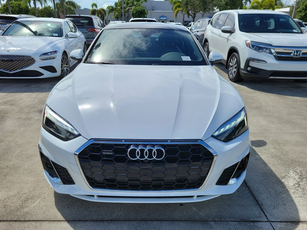 CARFAX One-Owner. Glacier White 2024 Audi A5 Sportback 45 S line Premium Plus quattro 2.0L 4-Cylinder TFSI 7-Speed Automatic S tronic quattro 10 Speakers, 4-Wheel Disc Brakes, ABS brakes, Air Conditioning, Alloy wheels, AM/FM radio, Anti-whiplash front head restraints, Auto High-beam Headlights, Auto-dimming Rear-View mirror, Automatic temperature control, Brake assist, Bumpers: body-color, Compass, Delay-off headlights, Driver door bin, Driver vanity mirror, Dual front impact airbags, Dual front side impact airbags, Electronic Stability Control, Emergency communication system: Audi connect CARE, Exterior Parking Camera Rear, Four wheel independent suspension, Front anti-roll bar, Front Bucket Seats, Front Center Armrest, Front dual zone A/C, Front fog lights, Front reading lights, Garage door transmitter: HomeLink, Genuine wood console insert, Genuine wood dashboard insert, Genuine wood door panel insert, Heated door mirrors, Heated front seats, Heated Front Sport Seats, Heated steering wheel, Illuminated entry, Knee airbag, Leather Seating Surfaces, Leather Shift Knob, Leather steering wheel, Low tire pressure warning, Occupant sensing airbag, Outside temperature display, Overhead airbag, Overhead console, Panic alarm, Passenger door bin, Passenger vanity mirror, Power adjustable front head restraints, Power door mirrors, Power driver seat, Power Liftgate, Power moonroof, Power passenger seat, Power steering, Power windows, Radio data system, Radio: Audi Sound System, Rain sensing wipers, Rear air conditioning, Rear anti-roll bar, Rear reading lights, Rear seat center armrest, Rear window defroster, Remote keyless entry, Speed control, Speed-sensing steering, Speed-Sensitive Wipers, Split folding rear seat, Steering wheel mounted audio controls, Tachometer, Telescoping steering wheel, Tilt steering wheel, Traction control, Trip computer, Turn signal indicator mirrors, Variably intermittent wipers, and Wheels: 18" 5-Double-Spoke Design.