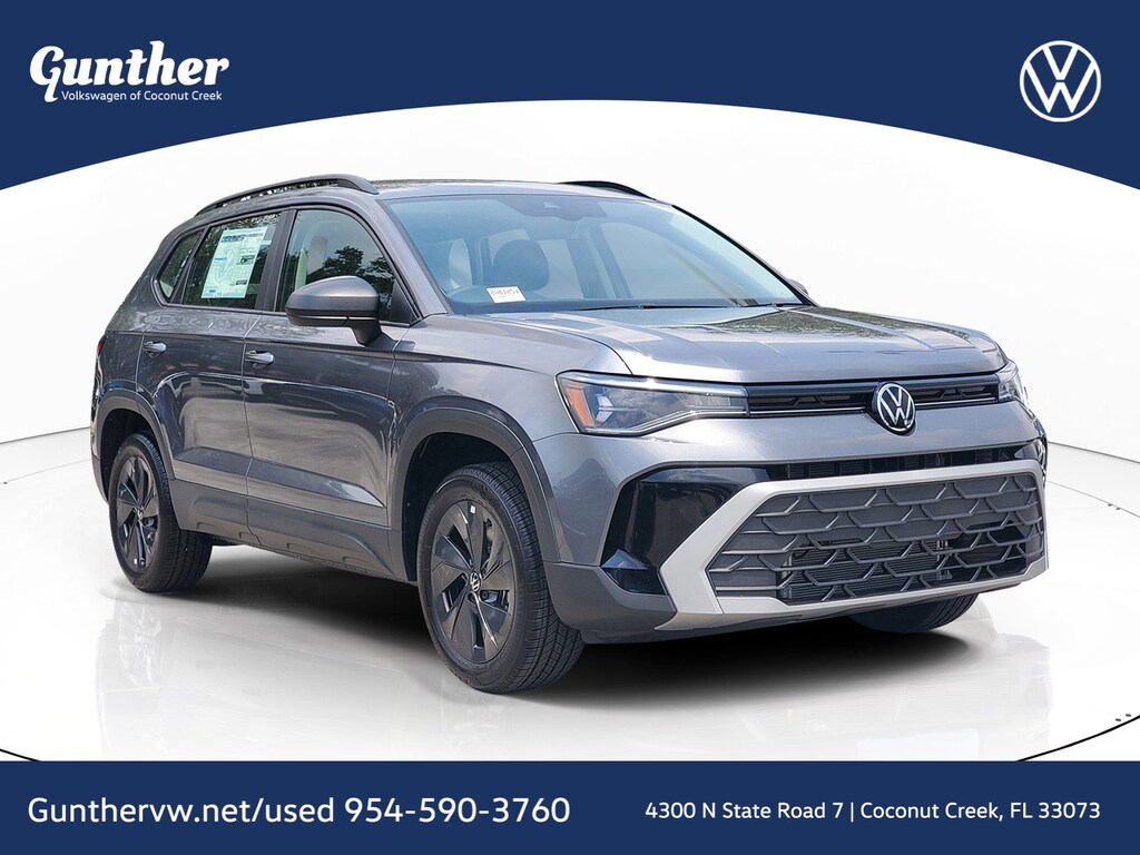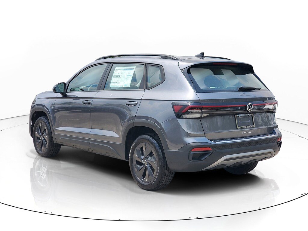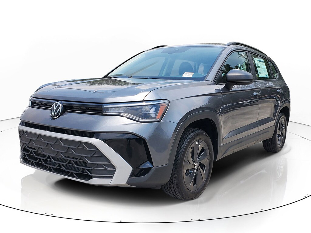 Platinum Gray Metallic 2025 Volkswagen Taos 1.5T S 1.5L I4 Turbocharged DOHC 16V LEV3-SULEV30 174hp 8-Speed Automatic with Tiptronic FWD 4-Wheel Disc Brakes, 6 Speakers, ABS brakes, Active Blind Spot Monitor, Air Conditioning, Alloy wheels, AM/FM radio, Auto High-beam Headlights, Brake assist, Bumpers: body-color, Chrome Bumperdillo Protection Plate For Rear Bumper, Cloth Seating Surfaces, Compass, Delay-off headlights, Driver door bin, Driver vanity mirror, Dual front impact airbags, Dual front side impact airbags, Electronic Stability Control, Emergency communication system: VW Car-Net Safe & Secure 5-year, Exterior Parking Camera Rear, Front anti-roll bar, Front Bucket Seats, Front Center Armrest, Front reading lights, Front Strut Rear Torsion Beam Suspension, Front wheel independent suspension, Fully automatic headlights, Heated steering wheel, Illuminated entry, Leather Shift Knob, Low tire pressure warning, Occupant sensing airbag, Outside temperature display, Overhead airbag, Overhead console, Panic alarm, Passenger door bin, Passenger vanity mirror, Power door mirrors, Power steering, Power windows, Radio data system, Radio: MIB3 Composition Color AM/FM, Rain sensing wipers, Rear anti-roll bar, Rear seat center armrest, Rear window defroster, Rear window wiper, Remote keyless entry, Retractable Privacy Cover For Cargo Area Blocks, Rubber Mats Kit, Speed control, Speed-sensing steering, Split folding rear seat, Spoiler, Steering wheel mounted audio controls, Tachometer, Telescoping steering wheel, Tilt steering wheel, Traction control, Trip computer, Variably intermittent wipers, and Wheels: 17" Dark Silver Painted Alloy.