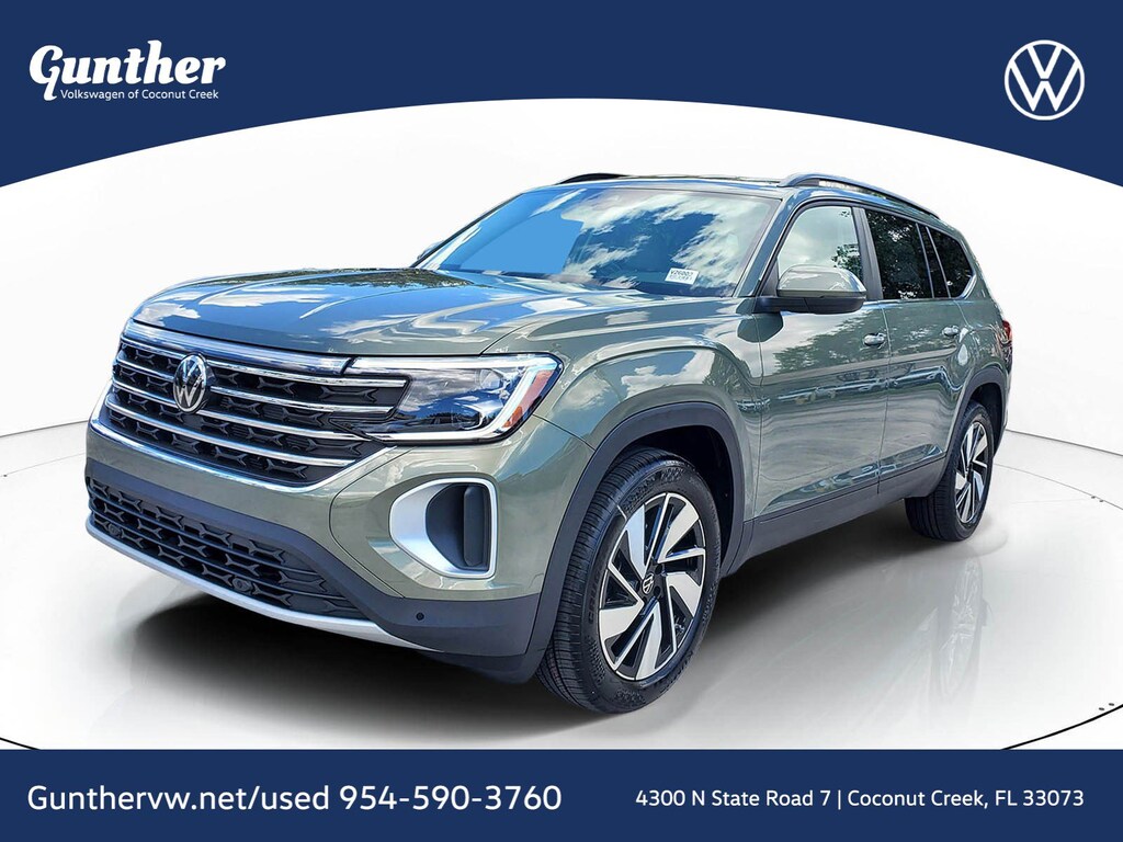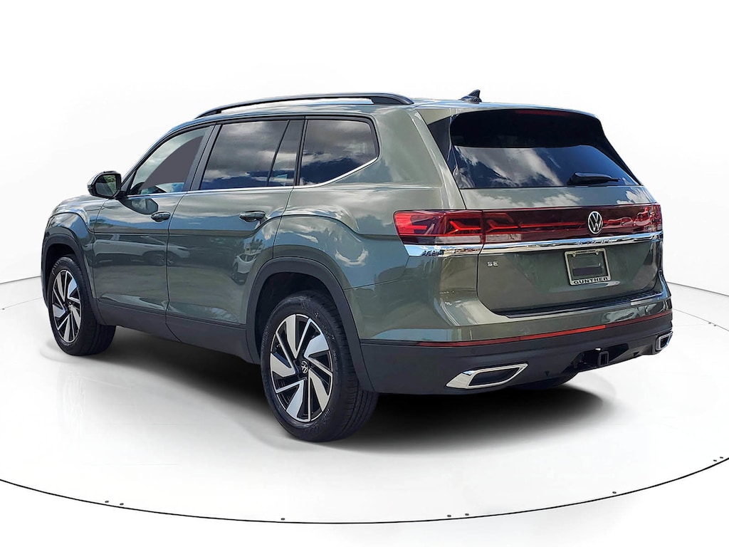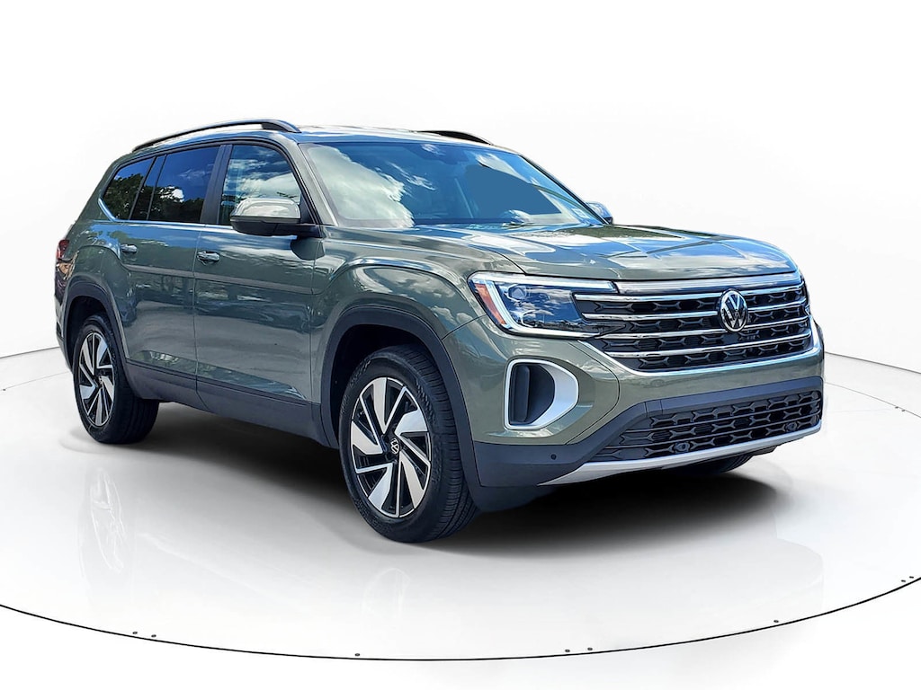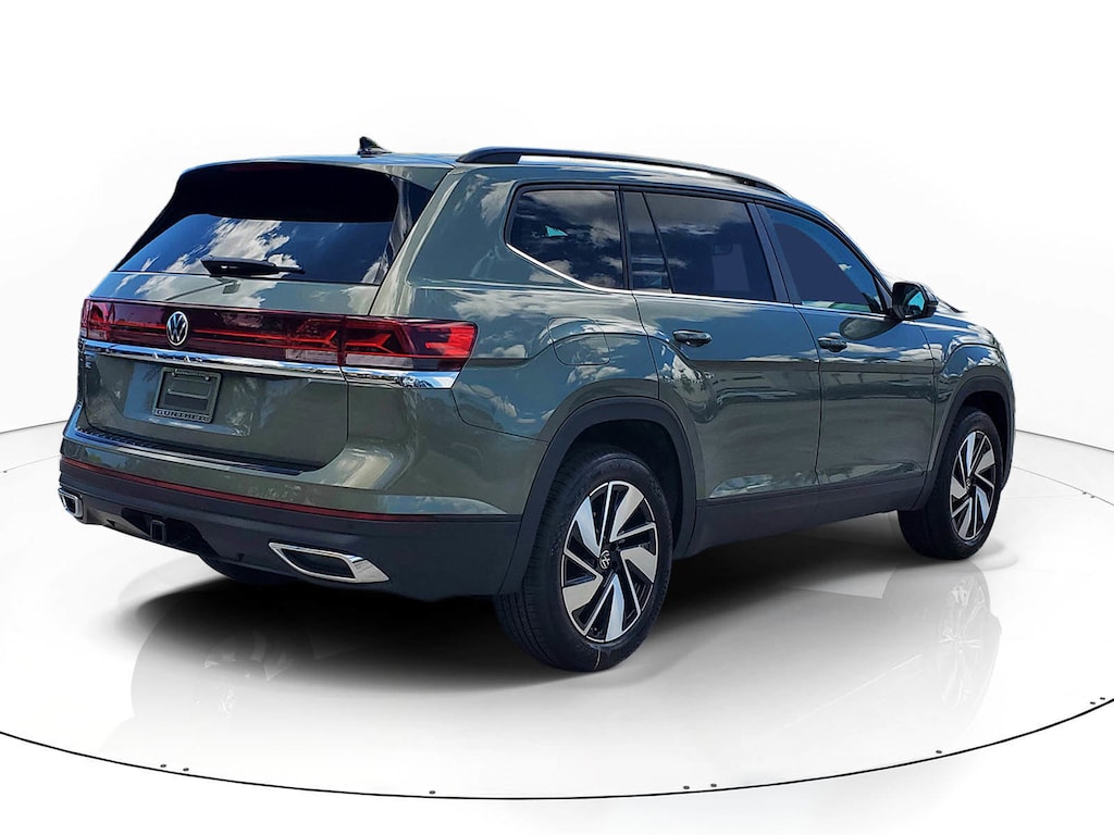Green Pearl 2026 Volkswagen Atlas 2.0T SE w/Technology 2.0L TSI 8-Speed Automatic with Tiptronic FWD 3rd row seats: split-bench, 4-Wheel Disc Brakes, 4-Wheel Independent Suspension, 6 Speakers, ABS brakes, Air Conditioning, Alloy wheels, AM/FM radio: SiriusXM with 360L, Auto High-beam Headlights, Auto-dimming Rear-View mirror, Automatic temperature control, Brake assist, Bumpers: body-color, Compass, Delay-off headlights, Driver door bin, Driver vanity mirror, Dual front impact airbags, Dual front side impact airbags, Electronic Stability Control, Emergency communication system: VW Car-Net Safe & Secure 5-year, Exterior Parking Camera Rear, First Aid Kit, Four wheel independent suspension, Front anti-roll bar, Front Bucket Seats, Front Center Armrest, Front dual zone A/C, Front fog lights, Front reading lights, Fully automatic headlights, Garage door transmitter: HomeLink, Heated and Actively Ventilated Front Bucket Seats, Heated door mirrors, Heated front seats, Heated steering wheel, Heavy Duty Trunk Liner with VW CarGo Blocks, Illuminated entry, Low tire pressure warning, Occupant sensing airbag, Outside temperature display, Overhead airbag, Overhead console, Panic alarm, Passenger door bin, Passenger vanity mirror, Perforated V-Tex Leatherette Seating Surfaces, Power door mirrors, Power driver seat, Power Liftgate, Power steering, Power windows, Radio data system, Radio: MIB3 Composition Media, Rain sensing wipers, Rear air conditioning, Rear anti-roll bar, Rear reading lights, Rear seat center armrest, Rear window defroster, Rear window wiper, Remote keyless entry, Retractable Privacy Cover For Cargo Area, Roadside Assistance Kit, Rubber Mats Kit (2-Row), Security system, Speed control, Speed-sensing steering, Split folding rear seat, Spoiler, Steering wheel mounted audio controls, Tachometer, Telescoping steering wheel, Tilt steering wheel, Traction control, Trip computer, Turn signal indicator mirrors, Variably intermittent wipers, Ventilated front seats, and Wheels: 20" 2-Tone Machined Alloy.