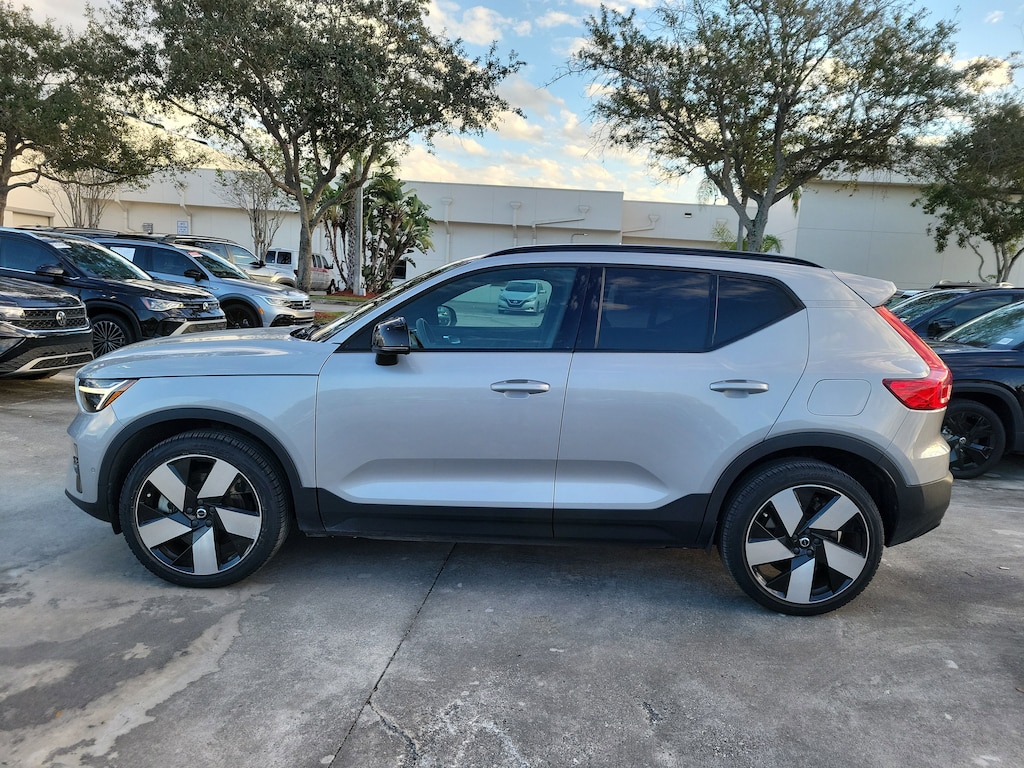 CARFAX One-Owner. Silver 2023 Volvo XC40 Recharge Pure Electric Ultimate Electric Motor 1-Speed Automatic AWD Internet access capable: Digital Services Package w/ 4 Year Subscription, 13 Speakers, 4-Wheel Disc Brakes, ABS brakes, Air Conditioning, Alloy wheels, Apple CarPlay, Audio memory, Auto High-beam Headlights, Auto-dimming door mirrors, Auto-dimming Rear-View mirror, Automatic temperature control, Brake assist, Bumpers: body-color, Connect Suede Textile/Microtech Upholstery, Delay-off headlights, Driver door bin, Driver vanity mirror, Dual front impact airbags, Dual front side impact airbags, Electronic Stability Control, Emergency communication system, Exterior Parking Camera Rear, Four wheel independent suspension, Front anti-roll bar, Front Bucket Seats, Front Center Armrest, Front dual zone A/C, Front fog lights, Front reading lights, Fully automatic headlights, Garage door transmitter: HomeLink, harman/kardon® Speakers, Headlight cleaning, Heated door mirrors, Heated Front Seats, Heated front seats, Heated rear seats, Heated steering wheel, HVAC memory, Illuminated entry, Knee airbag, Leather Shift Knob, Low tire pressure warning, Memory seat, Navigation system: Sensus Navigation Pro, Occupant sensing airbag, Outside temperature display, Overhead airbag, Overhead console, Panic alarm, Passenger door bin, Passenger vanity mirror, Power door mirrors, Power driver seat, Power Liftgate, Power moonroof, Power passenger seat, Power steering, Power windows, Radio data system, Radio: harman/kardon Premium Audio System, Rain sensing wipers, Rear anti-roll bar, Rear fog lights, Rear reading lights, Rear seat center armrest, Rear window defroster, Rear window wiper, Remote keyless entry, Security system, Speed control, Speed-sensing steering, Split folding rear seat, Spoiler, Steering wheel mounted audio controls, Telescoping steering wheel, Tilt steering wheel, Traction control, Trip computer, Turn signal indicator mirrors, Variably intermittent wipers, and Wheels: 20" 5-V Spoke Matte Graphite Diamond Cut Alloy.