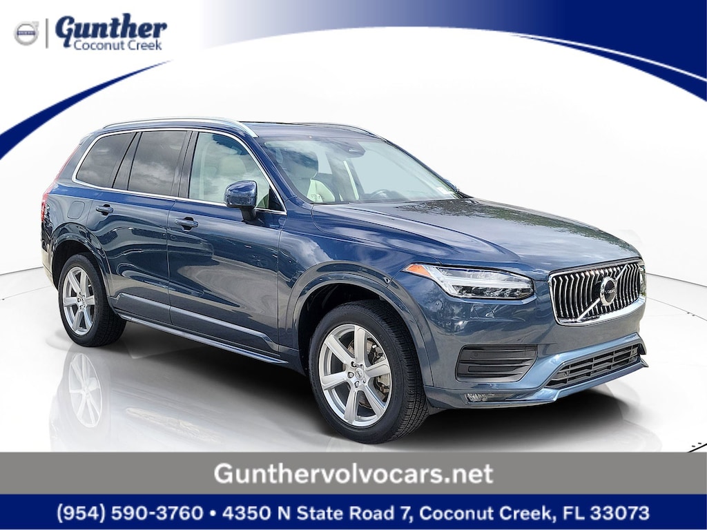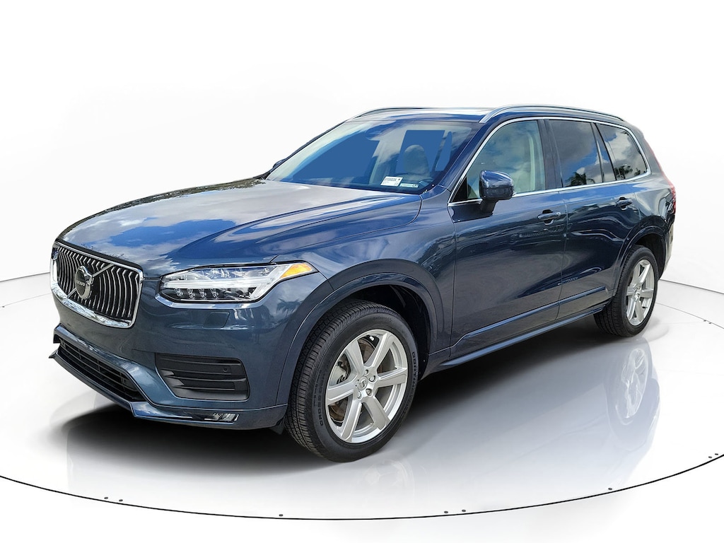 CARFAX One-Owner. Denim Blue Metallic 2023 Volvo XC90 B5 Core 2.0L I4 Turbocharged DOHC 16V LEV3-ULEV70 Automatic with Geartronic AWD Climate Package (Heated Rear Seats and Heated Steering Wheel), Protection Package Premier (Bumper Cover, Cargo Tray, First Aid Kit, Rubber Floor Mats, and Wheel Locks), 10 Speakers, 3rd row seats: bucket, 4-Wheel Disc Brakes, ABS brakes, Air Conditioning, Alloy wheels, AM/FM radio: SiriusXM, Anti-whiplash front head restraints, Apple CarPlay, Auto High-beam Headlights, Auto-dimming door mirrors, Auto-dimming Rear-View mirror, Automatic temperature control, Brake assist, Bumpers: body-color, Delay-off headlights, Driver door bin, Driver vanity mirror, Dual front impact airbags, Dual front side impact airbags, Electronic Stability Control, Emergency communication system: Volvo Cars App w/4 Year Subscription, Exterior Parking Camera Rear, Four wheel independent suspension, Front anti-roll bar, Front Bucket Seats, Front Center Armrest w/Storage, Front dual zone A/C, Front fog lights, Front reading lights, Fully automatic headlights, Garage door transmitter: HomeLink, Heated door mirrors, Heated Front Bucket Seats, Heated front seats, Illuminated entry, Knee airbag, Leather Shift Knob, Leatherette Upholstery, Low tire pressure warning, Memory seat, Navigation System, Occupant sensing airbag, Outside temperature display, Overhead airbag, Panic alarm, Passenger door bin, Passenger vanity mirror, Power door mirrors, Power driver seat, Power moonroof, Power passenger seat, Power steering, Power windows, Radio data system, Radio: High Performance Audio System, Rain sensing wipers, Rear air conditioning, Rear anti-roll bar, Rear dual zone A/C, Rear fog lights, Rear reading lights, Rear seat center armrest, Rear window defroster, Rear window wiper, Remote keyless entry, Security system, Speed control, Speed-sensing steering, Split folding rear seat, Spoiler, Steering wheel mounted audio controls, Tachometer, Telescoping steering wheel, Traction control, Trip computer, Turn signal indicator mirrors, Variably intermittent wipers, and Wheels: 19" 6-Spoke Turbine Sparkling Silver Alloy.